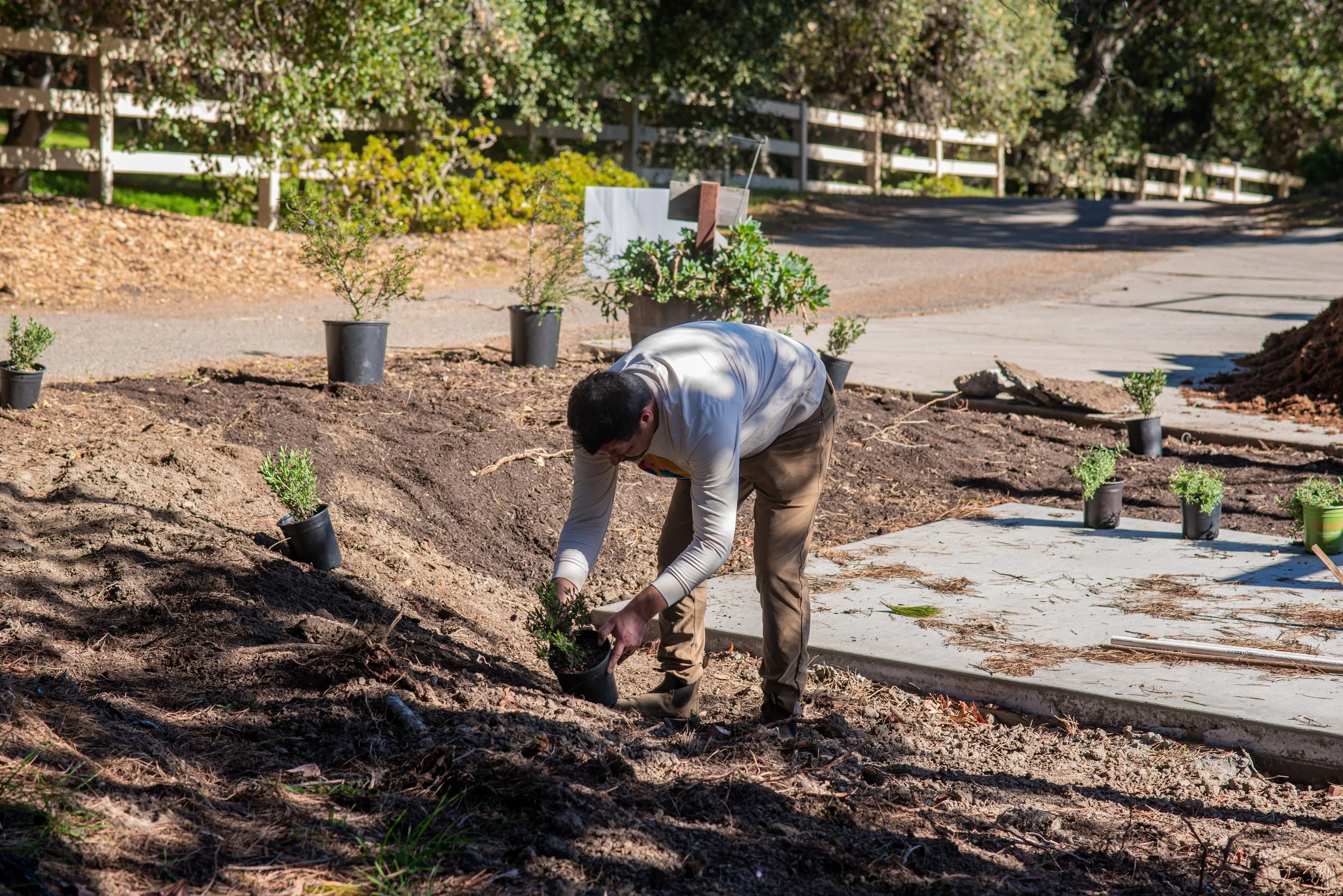Principal Designer Enrique places plants for install at a job site.