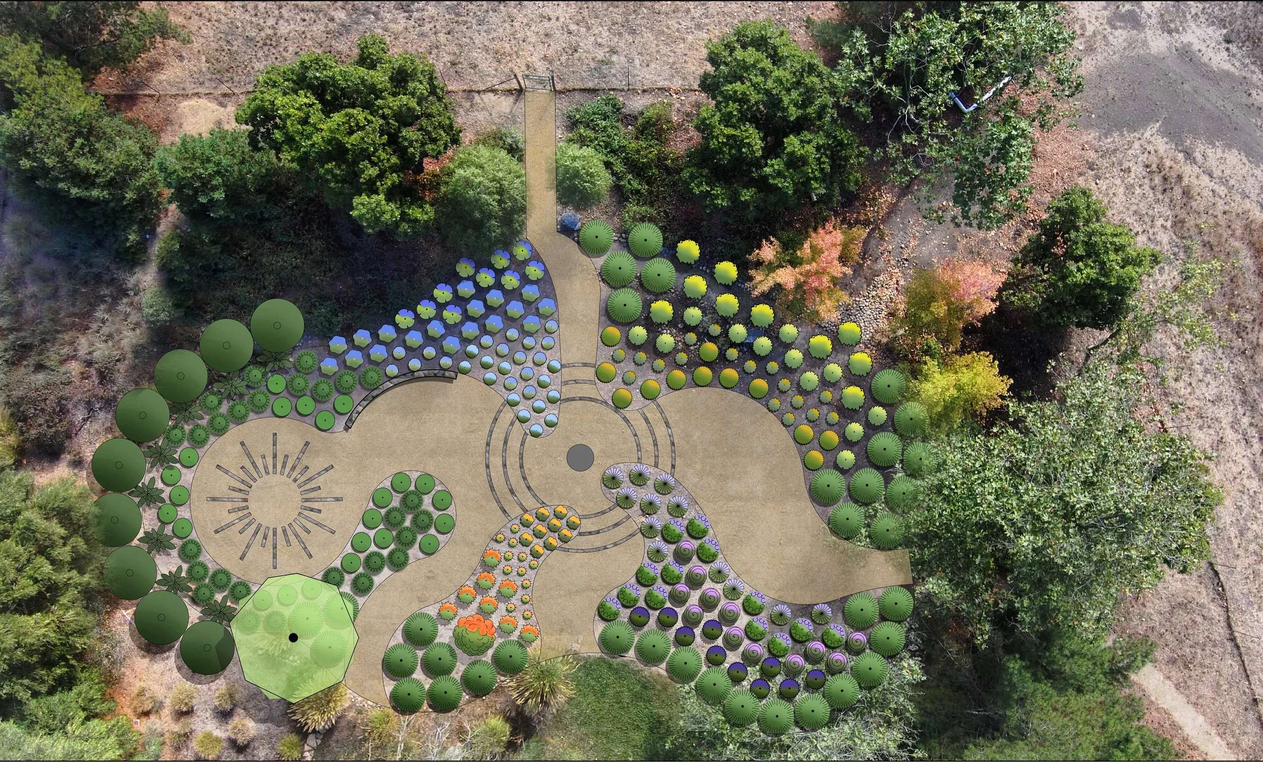 A planting plan concept at a plan view perspective using drone footage of the existing site.