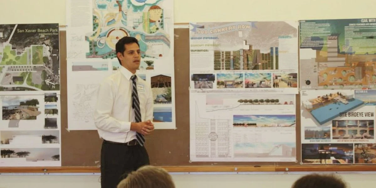 Enrique Guzman presents and pitches a master plan at a fundraiser. His education at Cal Poly and lessons in studio presentations have set him up for success at every stage of the business's growth.
